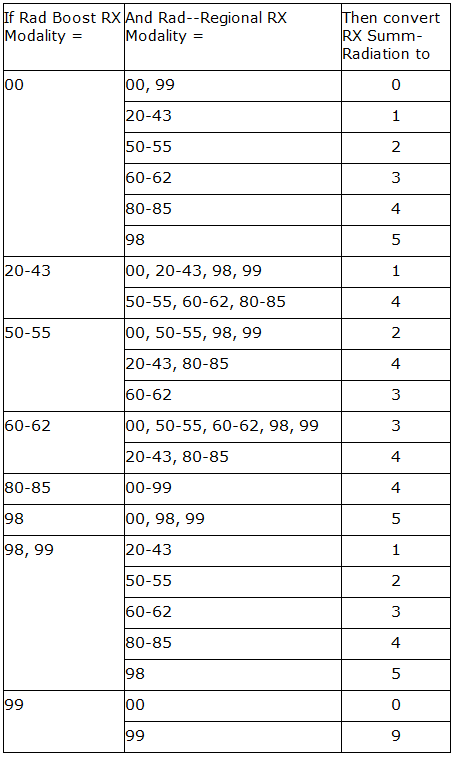If the transmitted value is not numeric, the new case record version is A or later, and Date_DX >= 20030101, then generate RX Summ-Radiation from Rad_Boost_RX_Mod and Rad--Regional RX Modality according to the rules in the corresponding conversion table in the UPDATE section below).